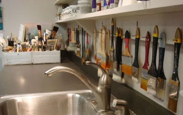 I have found that when working with acrylics, everything centers around a sink- critical when designing a studio.